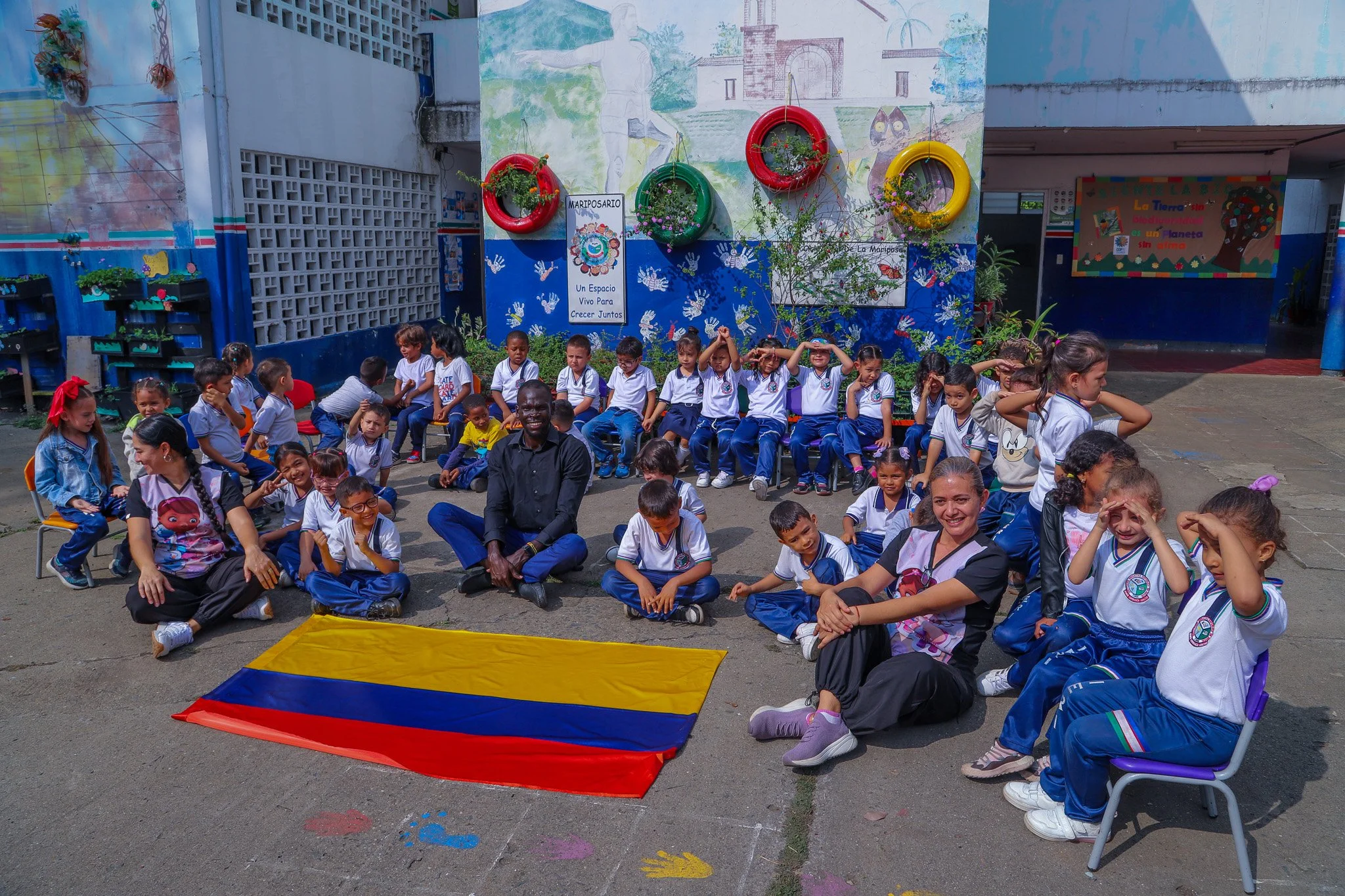 Scholar Aiita (in the centre of the photo) visiting a local primary school while attending COP16 in Colombia